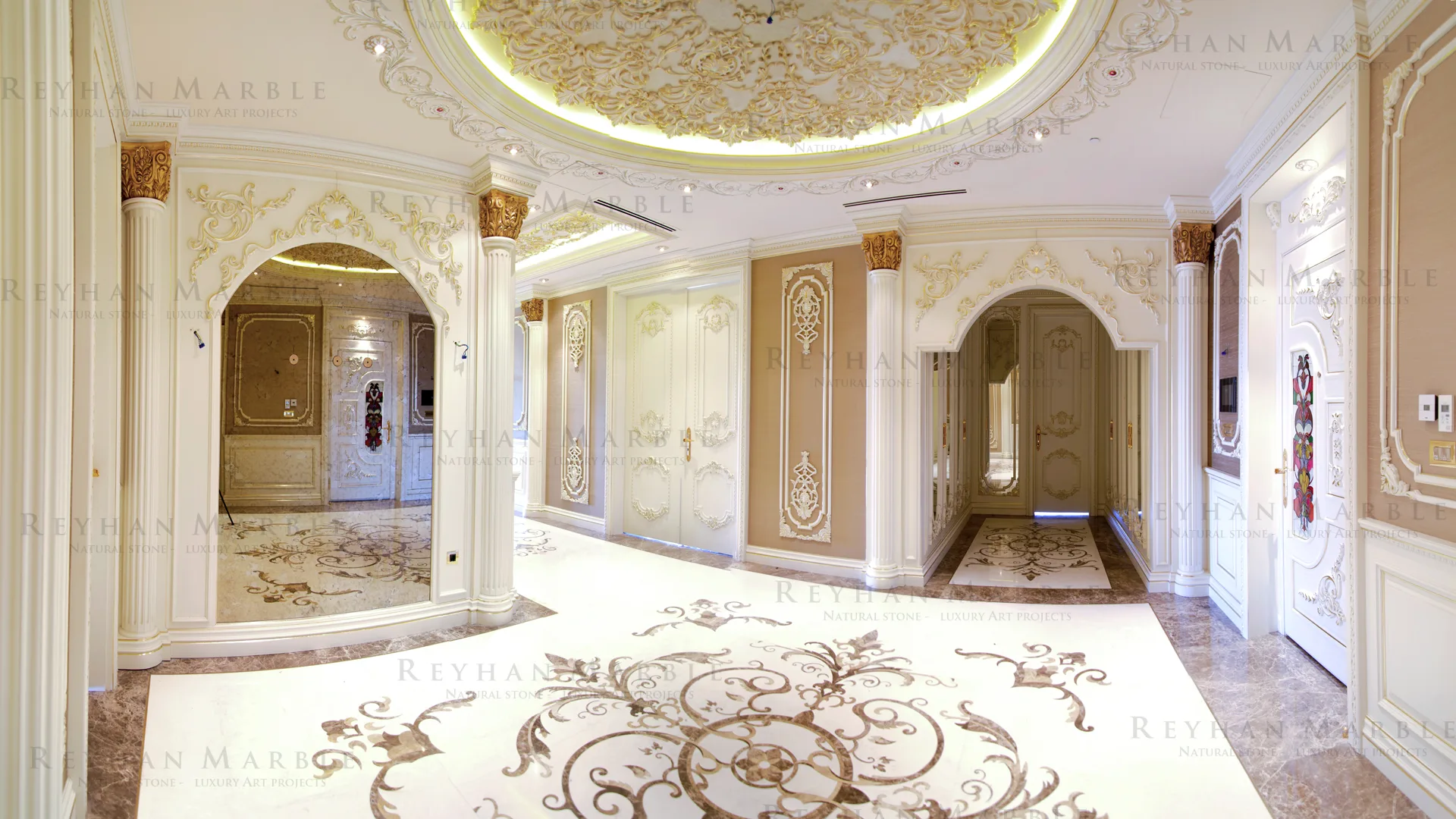 This project includes premium natural stone selection, precision cutting, and large-format installation for a luxury hotel lobby.